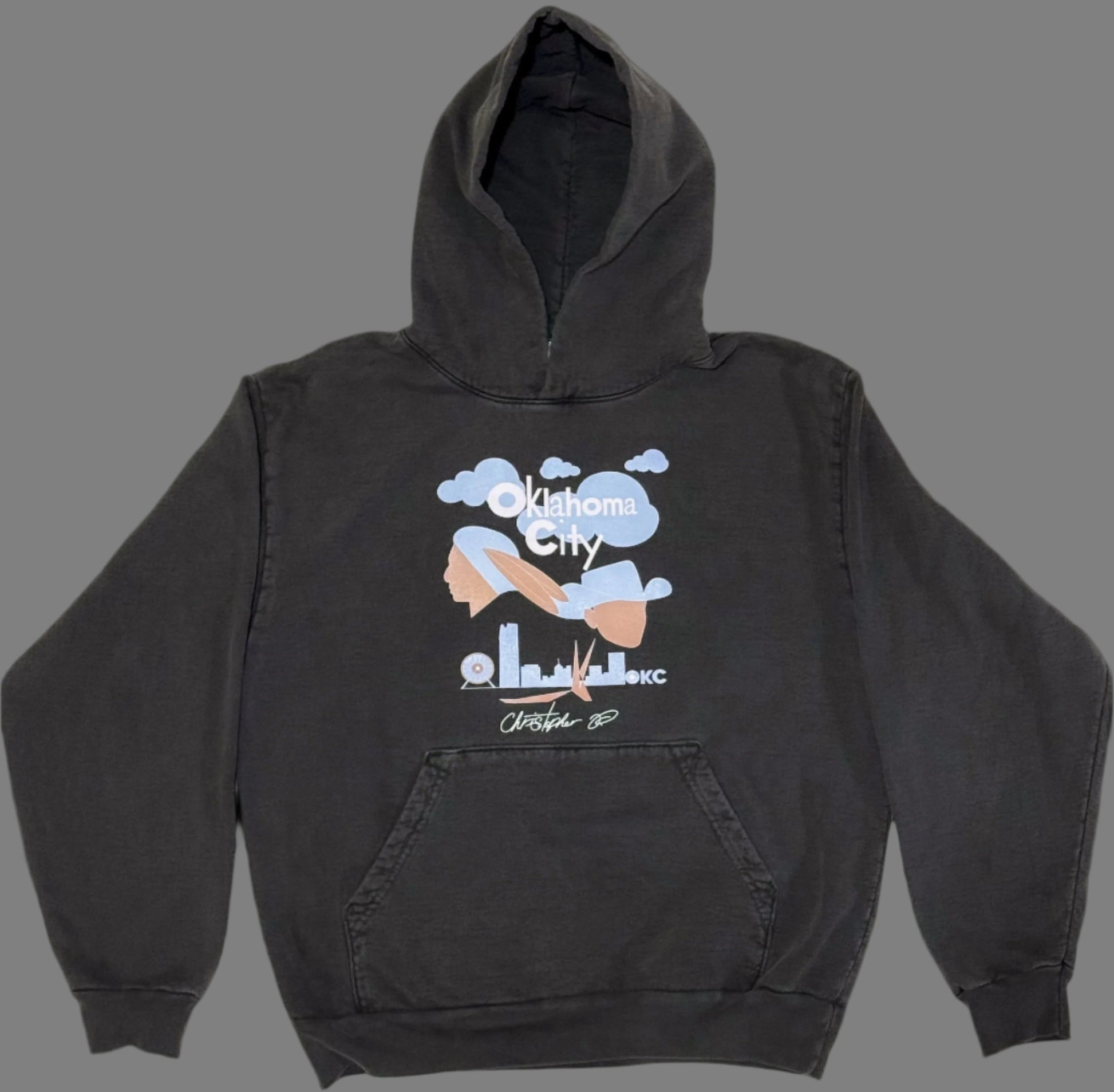 Our vintage styled hoodie, features a superior, heavyweight cotton fleece for ultimate comfort and durability. Along the iconic OKC skyline, it pays homage to the city's Cowboy and Native American roots. The Christopher P. signature logo adds a touch of personalization. Perfect for both style and warmth.